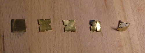 Jag håller på med ett litet experiment, ströningar i mässingsplåt med pålödd spik. Jag använder 0,7 mm mässingsplåt och 2 mm mässingstråd.