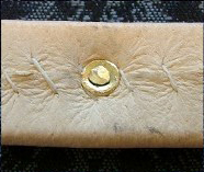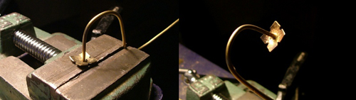 För att fixera stiftet i rätt läge böjs tråden och sätts fast i ett skruvstycke så att änden är vinkelrät mot ströningen och så att den med trådens egen fjädring lägger ett lätt tryck mot plåten. Under plåtströningen ligger en liten metallring för att minska värmeöverföringen till skruvstycket. Ytorna som ska lödas samman skrapas/filas fria från oxid, bestryks med lödvatten och en liten bit silverlod läggs intill lödskarven, även den bestruken med lödvatten. Efter lödningen har lodet flutit ut och ger en jämn och fin övergång från tråden till plåten. Tråden sågas av en bit upp och filas något tillspetsad för att lättare passera hålen i läder och nitbricka. Innan nitningen sågas tråden av ca 1-1,5 mm utanför nitbrickan. Normalt sett brukar man säga att man behöver 1-1,5 gånger nitens diameter för att få en bra nitskalle. I praktiken får jag det trots att jag sågar av stiftet kortare men det kompenseras av att nitbrickan trycks ner en bit i lädret.