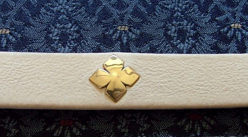 Ströningen på en bältesrem klädd med vitt vegetabilgarvat svinskinn. Remmen är 20 mm bred och den kvadratiska ströningen är 12 mm i sidan. I hörnet syns remmen från baksidan med nit, nitbricka och sömmen som håller skinnbeklädnaden på plats. Remmen och skinnet kommer från.