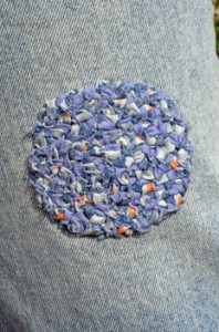 Gör en trefläta av de tunna trasorna. Rulla dem runt sig själv och sy ihop. Det är svårt att beskriva i text men titta på bilden så förstår du nog vad jag menar. Sy ihop tills du har fått den storlek du vill ha. Sy sedan fast lappen över hålet du vill laga.