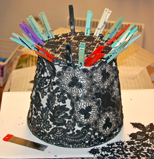Runt kanten nertill satte jag fast en “rak” bård av plastduken. Denna vek jag runt kanten och medan det torkade fick tvättklämmorna klämma åt.