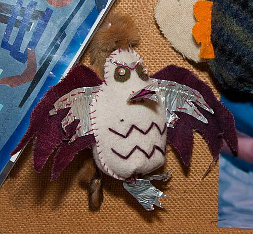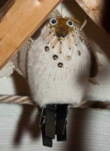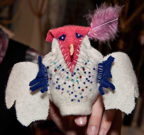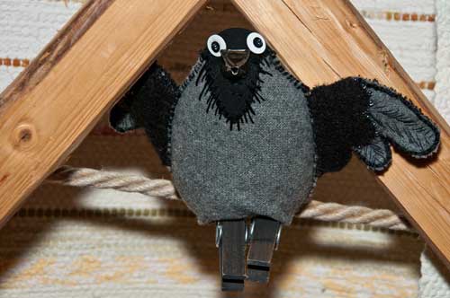 Den är sydd av ihopvakat ylletyg (vadmal, kläde eller ”för-hårt” tvättad ylletröja) och har näbb av tex plåt eller en trä. I nederkant fäster du klädnypor så att den kan sitta på tex en snodd, gren eller kanske på gardinen, eller lämnar hål för fingrarna så att fågeln kan änvändas som fingerdocka…