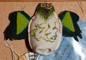 Därefter är det dags att sy detaljerna. Det gör var och en efter sin förmåga och så länge man har ork och lust. Sy ögon av knappar eller paljetter, dekorera med små stygn, garn och annat som passar… Den stoppade fågelkroppen är lätt att hålla i och man ser tydligt var ögon och andra detaljer hamnar när man syr. Även riktigt små barn kan vara med. Kerstin säger:
