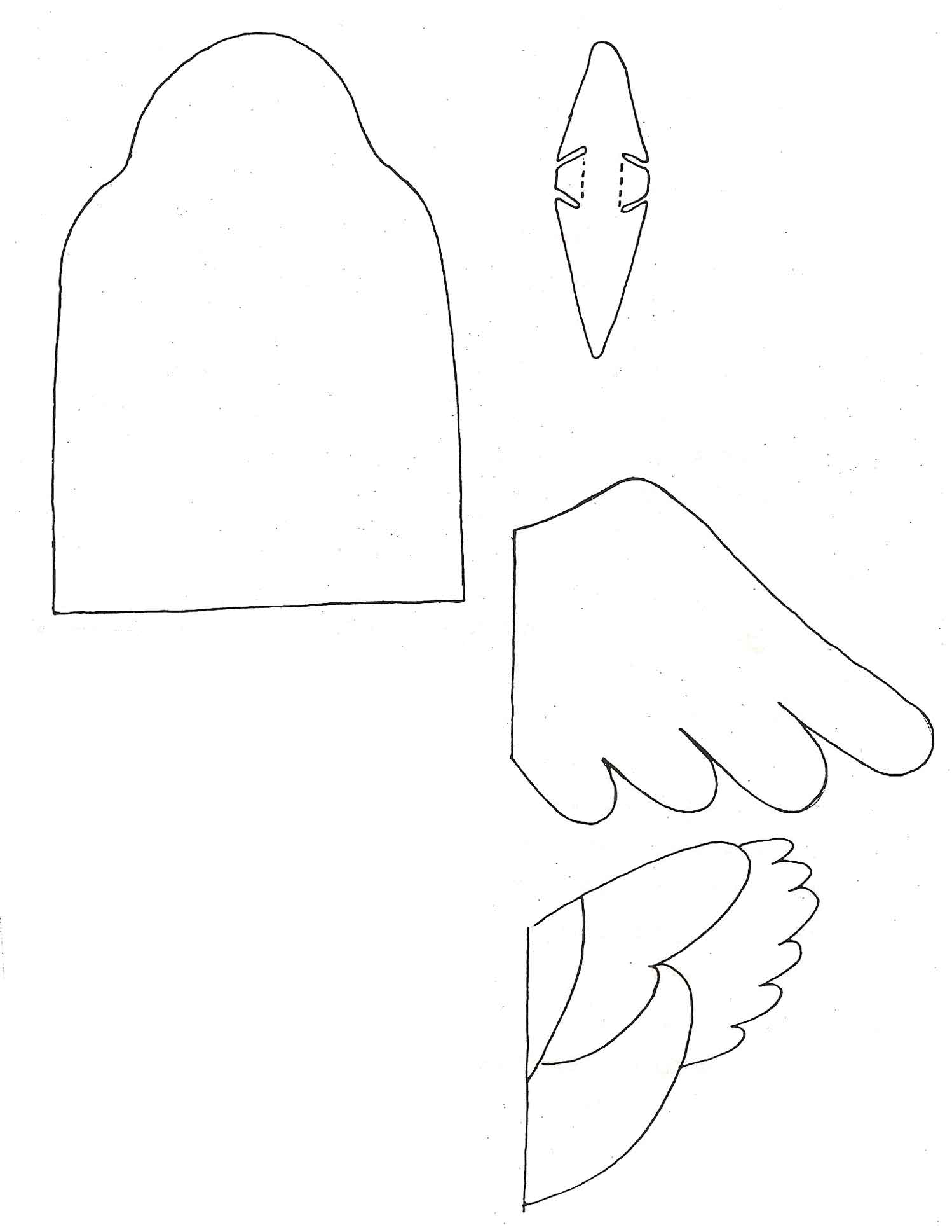 Skriv ut mallen och klipp ut de olika delarna (klicka på bilden för förstoring) eller gör egna fågelformer. Rita av kropp och vingar på tyget du vill använda. Det ska vara två bitar av varje del, förutom av näbben.