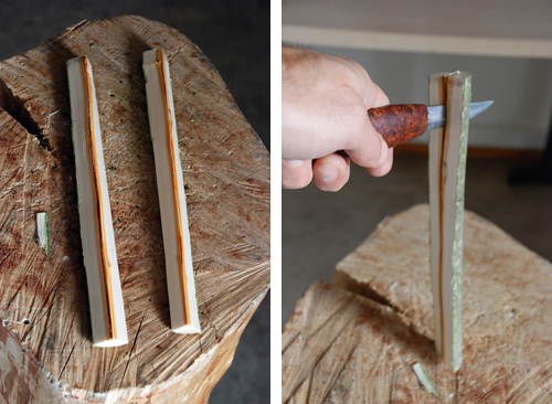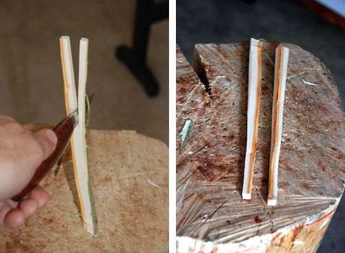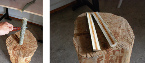 Klyv först en gång i mitten. Det går bra att använda kniven till detta eftersom ämnet till pinnarna inte är så stort. Man kan slå lite lätt med någon överbliven träbit på ryggen av kniven.