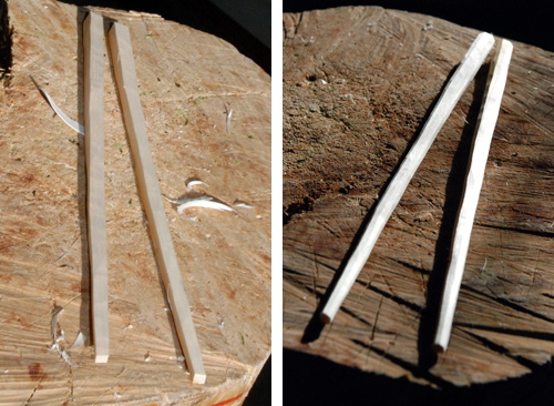 Klyv ner pinnarna till önskad storlek. Nu kan du utnyttja detta att klyvningen går snett när du inte klyver i mitten, då blir pinnarna på ett naturligt sätt lite tjockare i ena änden.