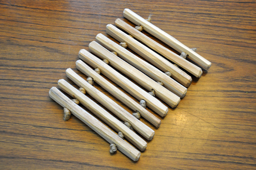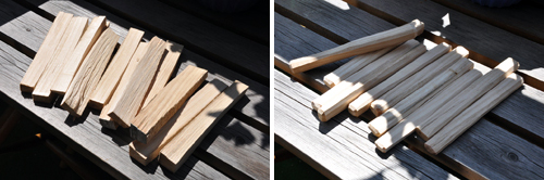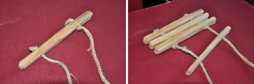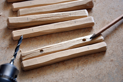 Du behöver två bitar kraftigt snöre och pinnar, eller en rätvuxen träbit att klyva pinnar ur. Tälj alla pinnar jämntjocka och i den form du vill ha dem. Ett tips är att göra dem lite rektangulära i tvärsnittet eftersom det är lättare att borra i dem då, speciellt jämfört med runda pinnar.