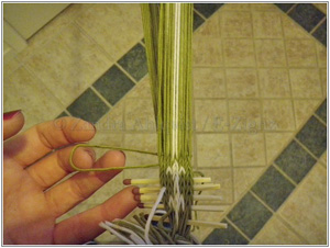 När du anser att det blir besvärligt att väva vidare, eller att du vill ändra håll på mönstret så börjar du vrida brickorna ett kvarts varv mot dig istället. Mönstret blir då vänt och tvinningen löses upp vartefter.